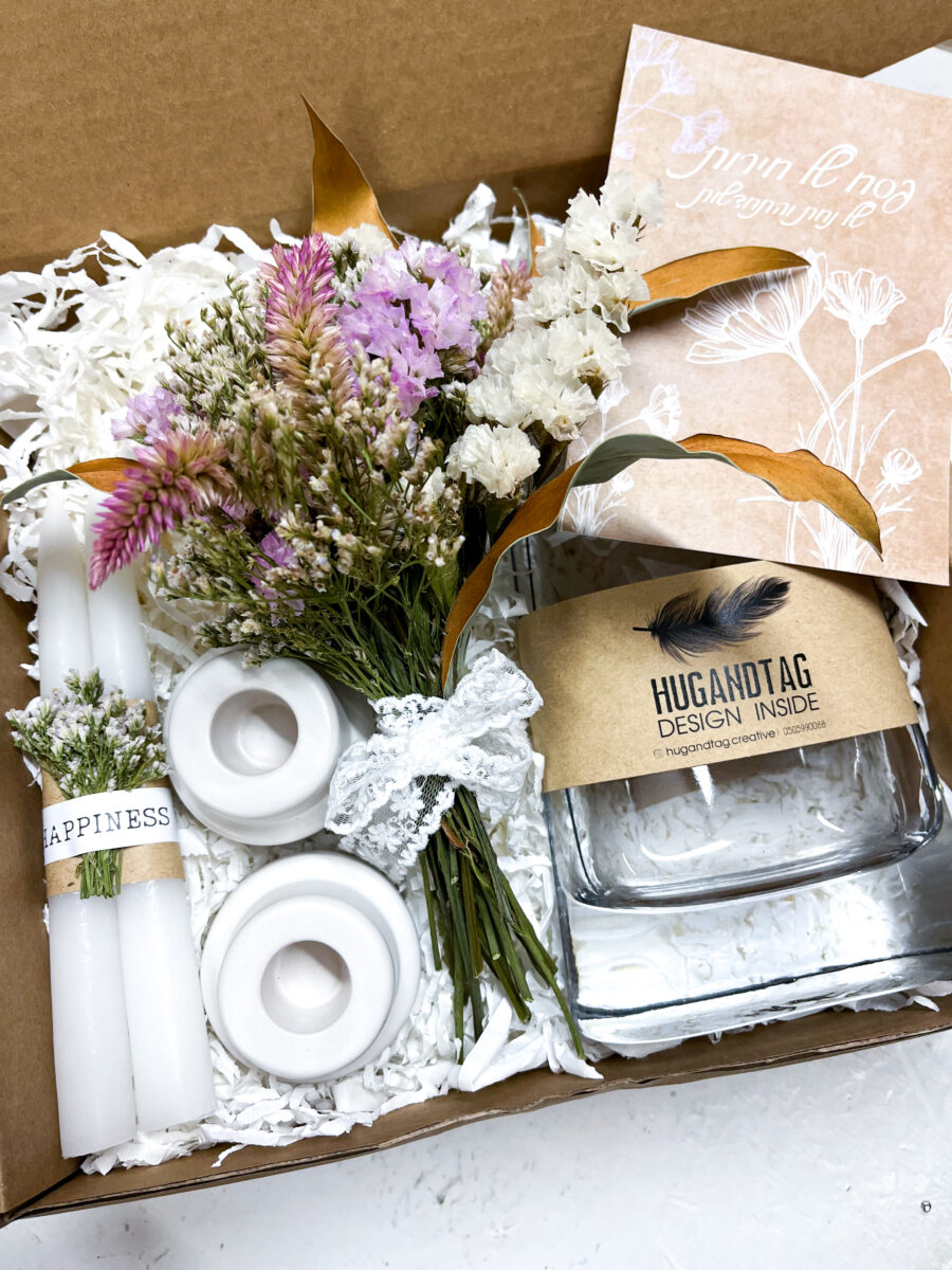 מתנה לבית ולחג אגרטל מיוחד, זר נצחי יבש, פמוטים ונרות